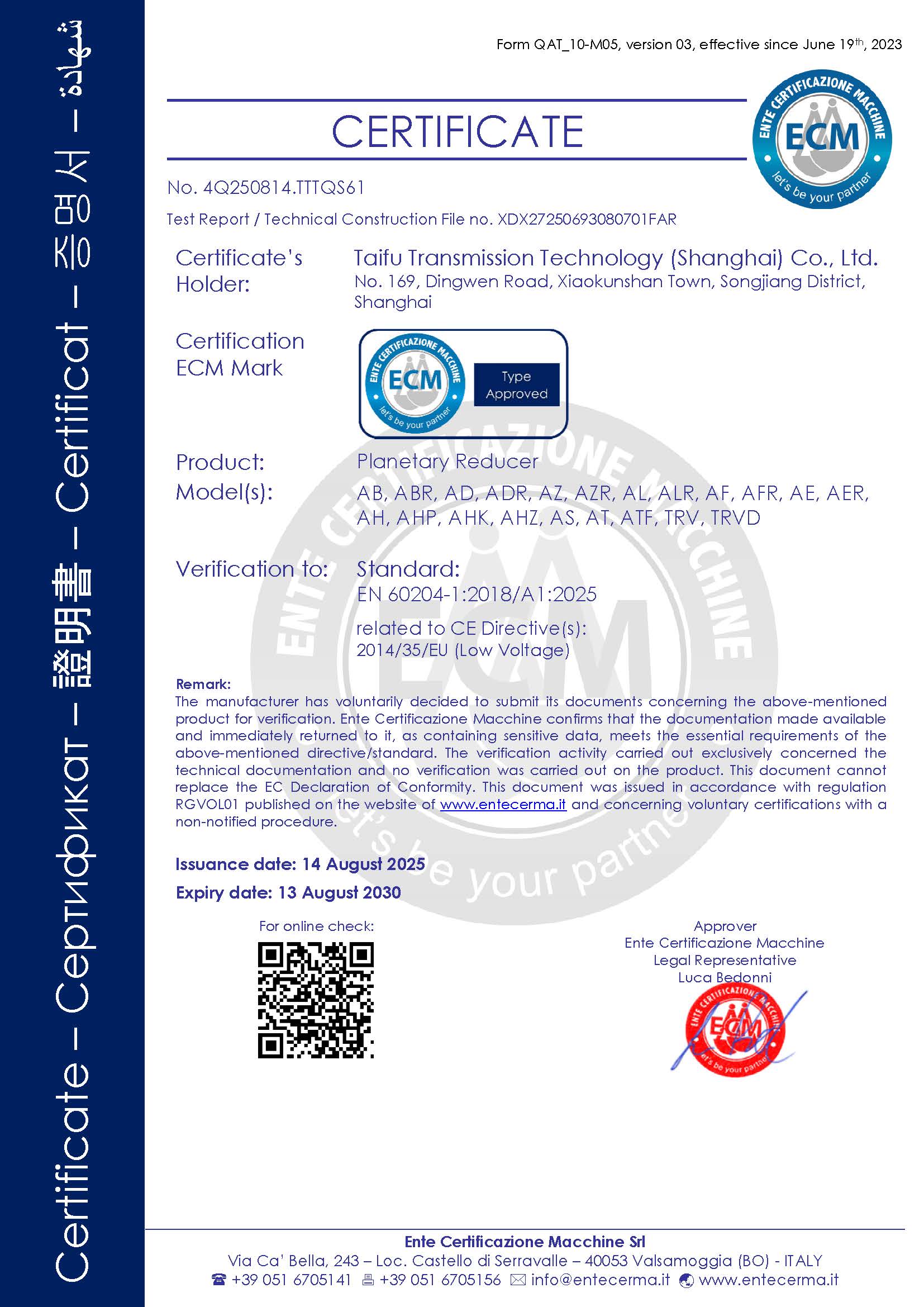 熱烈祝賀太弗傳動科技(上海)有限公司通過EN 60204-1:2018/A1:2025標準...